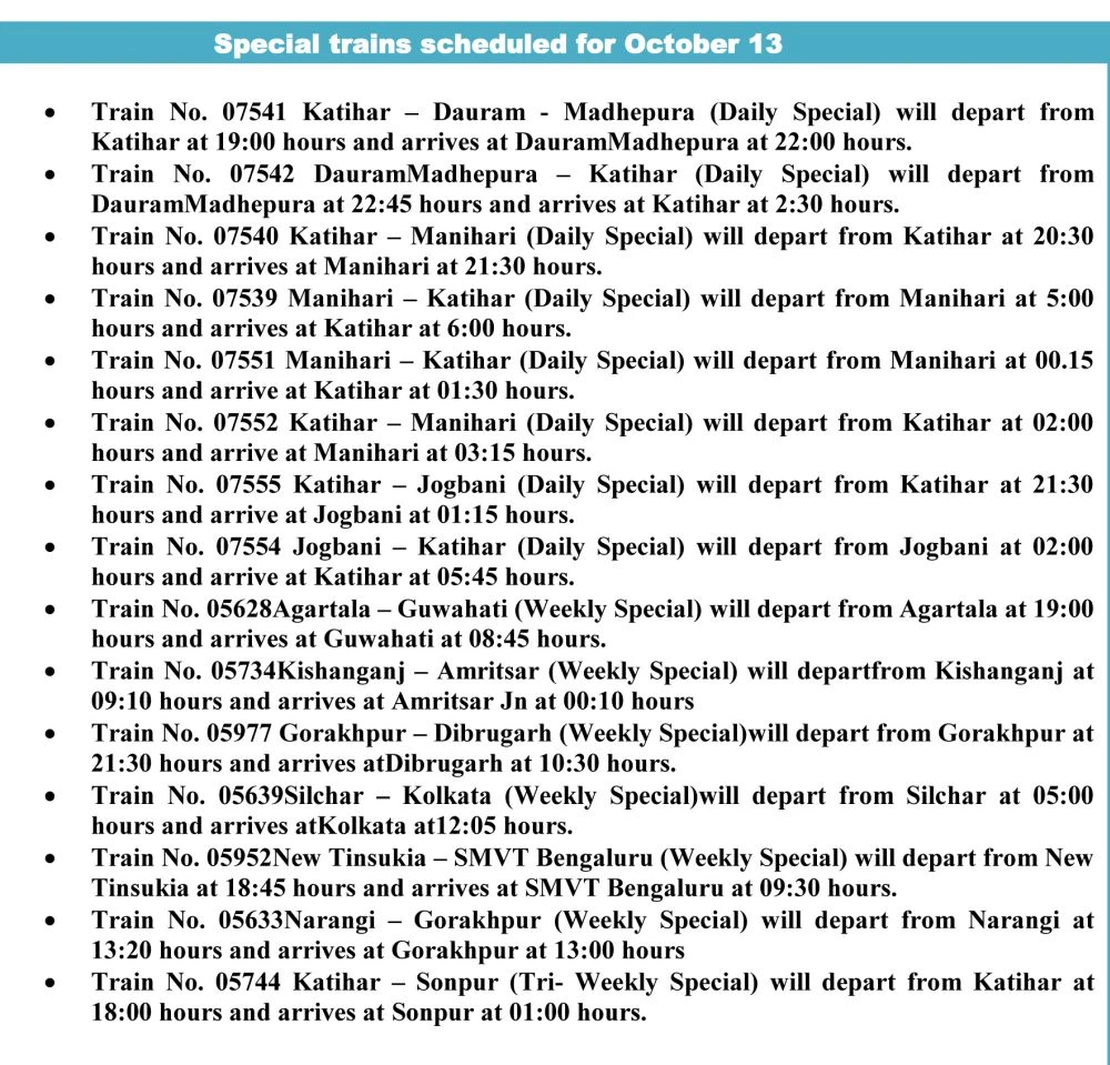 The special trains are being operated to key destinations such as Katihar, Kishanganj, New Jalpaiguri, Sonpur, Dauram, Madhepura, Agartala, New Tinsukia, SMVT Bengaluru, Amritsar, Patna, Dibrugarh, Gorakhpur, Silchar, Naharlagun, Kolkata, Guwahati, Ranchi, Charalapalli, Mumbai Central, Agra Cantt, Jogbani, Lumding, Howrah, Gomti Nagar, Anand Vihar, Kamakhya, and many others.