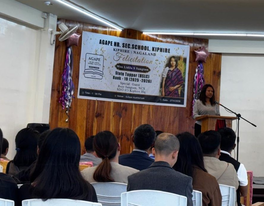 Kiphire April 27 (MExN): Agape Hr Sec School, Kiphire felicitated its HSLC top 19 topper Lidila S Sangtam at a ceremony held at the school auditorium on April 27.