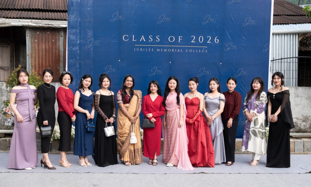 Outgoing students pose for a photo during the ‘Au Revoir 2026’ programme held at Jubilee Memorial College, Mokokchung on April 17.