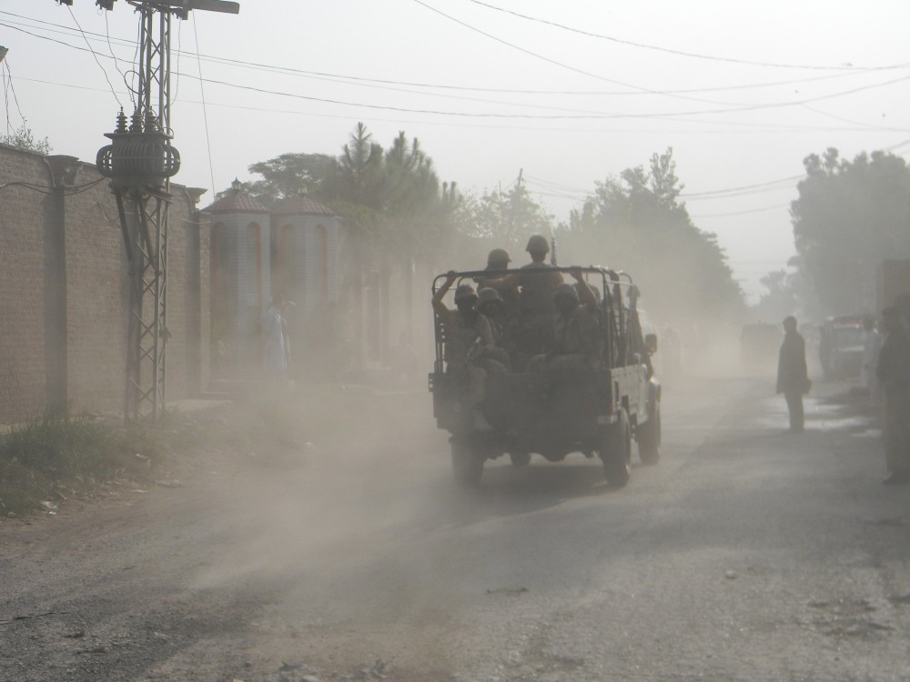 Pakistani soldiers arrive to take position outside the Pakistan Air Force base following an attack by militants in northwest Pakistan's Peshawar, Sept. 18, 2015. At least eight members of the Tehrik-e-Taliban Pakistan (TTP) were killed and 10 security personnel wounded in an attack on an air base of Pakistan Air Force near the country's northwestern provincial capital of Peshawar early Friday, a military spokesman said. (Xinhua/Ahmad Sidique/IANS)
