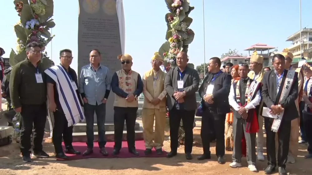 Prince of Tai Ahom Rajkumar Alok Narayan Singha inaugurates the ‘Testament of Friendship’ monolith during the Changki–Tai Ahom Cultural Connect at Changki village, Mokokchung, on February 10.
