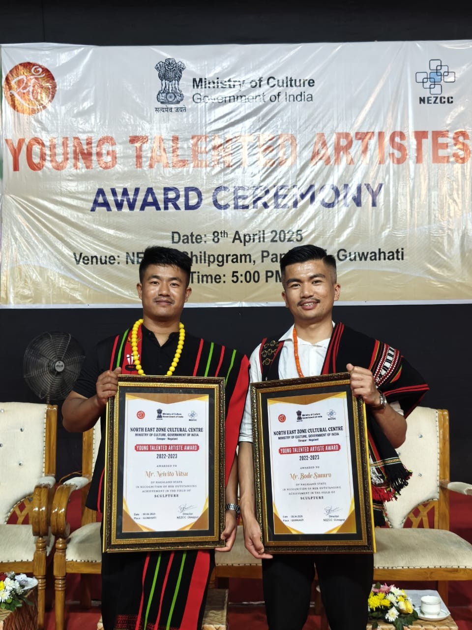 Two budding sculptors from Nagaland Bode Swüro and Neivito Vitsu are recipients of the prestigious NEZCC Young Talent Artiste Award for the year 2022-2023.