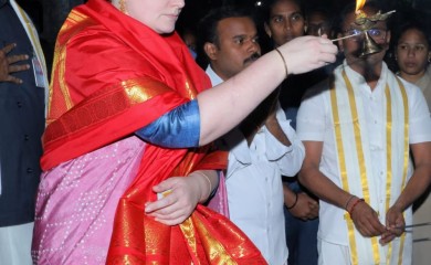 Tirupati, April 14 (IANS) Andhra Pradesh Deputy Chief Minister Pawan Kalyan's wife Anna Lezhneva on Monday offered prayers at the Sri Venkateswara temple at Tirumala to fulfill her vows following the safe recov