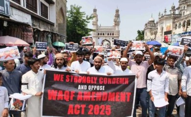 Hyderabad, April 11 (IANS) Muslims staged protests in Hyderabad on Friday against the Waqf (Amendment) Act, 2025.Protests were held at the historic Mecca Masjid near Charminar, at Dargah Ujale Shah mosque in Sa
