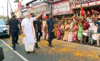 Kochi, April 24 (IANS) Prime Minister Narendra Modi, who arrived in Kochi on Monday evening for his two-day trip to Kerala dressed in typical local attire, took everyone by surprise when he decided to walk for
