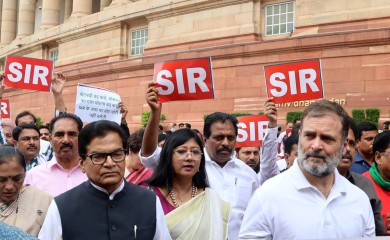 New Delhi, July 25 (IANS) Shouting slogans and symbolically tearing placards with Special Intensive Revision (SIR) printed on them, Opposition MPs led by the Leader of Opposition in Lok Sabha, Rahul Gandhi, on
