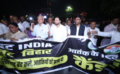 Patna, April 26 (IANS) Bihar Leader of the Opposition (LoP) Tejashwi Yadav said on Saturday that the INDIA Bloc stands firmly with the Union government against terrorism, following the tragic Pahalgam terror at