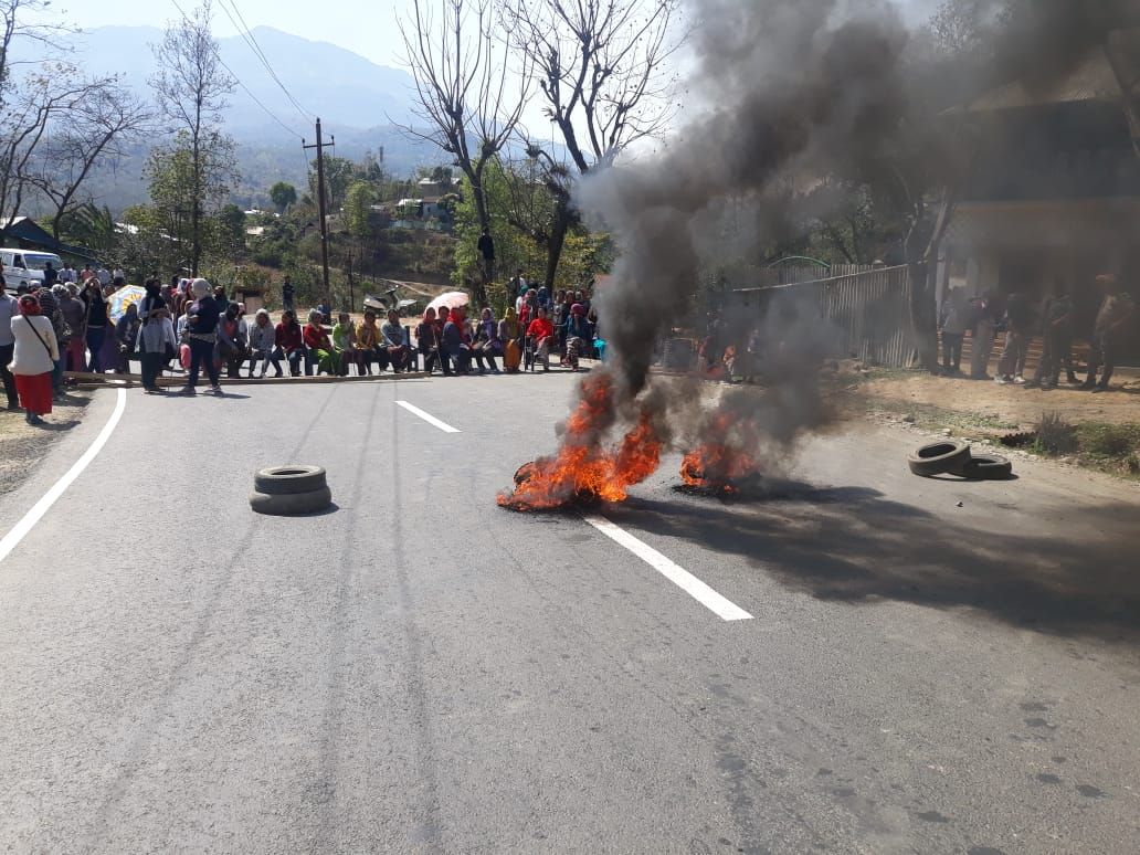 Protestors block National Highway-2 in Senapati and burn tyres after a bandh imposed by the people of the district on March 19. (NNN Photo)