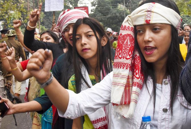 AASU supporters raise slogans during their ‘Gana Saityagrah’ protest against Citizenship Amendment Act, in Guwahati. (PTI Photo)