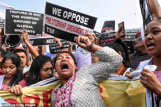 Demonstrators shout slogans as they hold placards to protest against the government's Citizenship Amendment Bill (CAB), during the shutdown called by North East Students' Organization, in Agartala in India's no