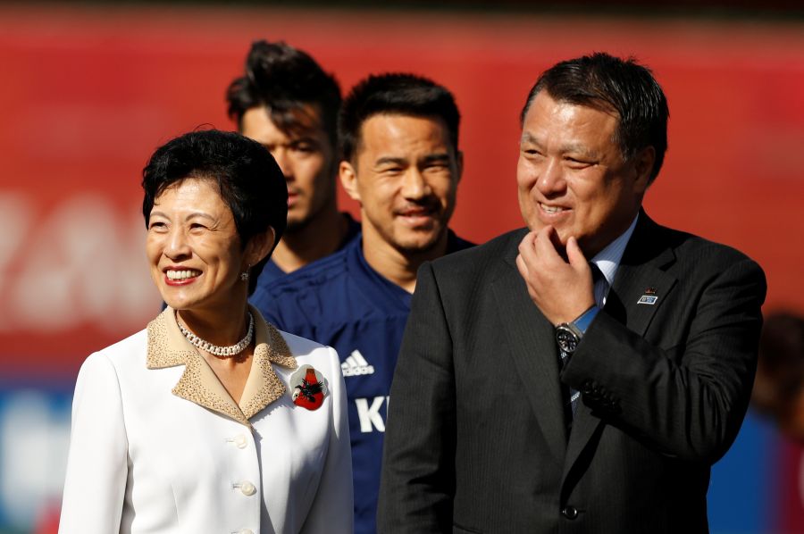 President of Japan Football Association Kozo Tashima and Japan's Princess Takamado attend the training REUTERS/John Sibley