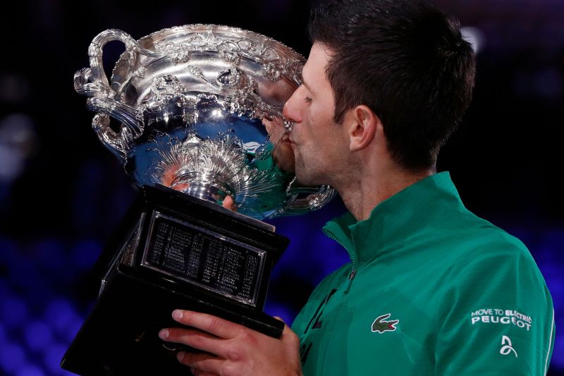 Serbia's Novak Djokovic kisses the trophy after winning his match against Austria's Dominic Thiem. (Reuters Photo)
