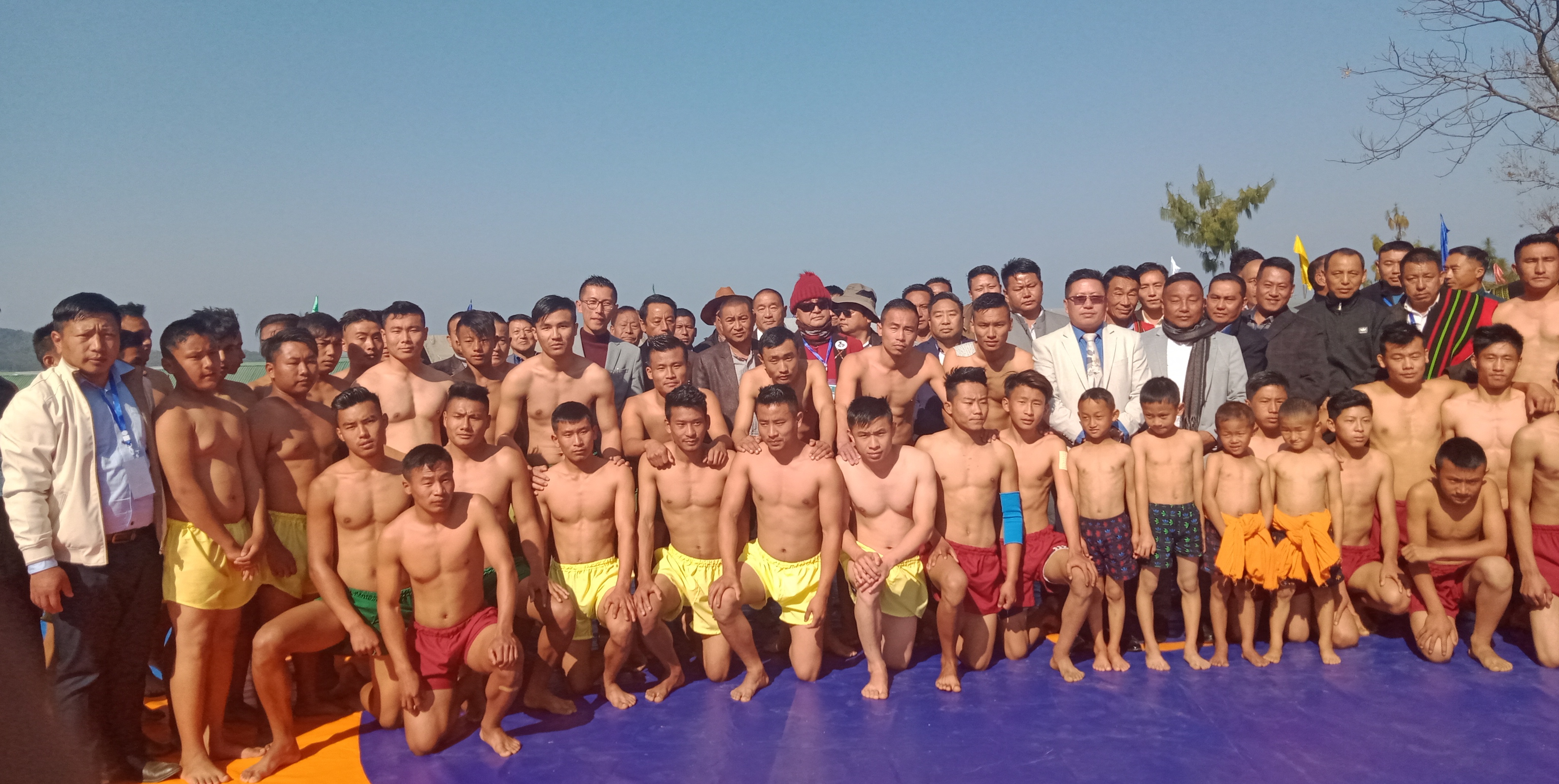 Neiketouzo Kengurüse and others with the participants of 65th Nerhema Wrestling meet 2020 at Nerhema village on January 18. (Morung Photo)