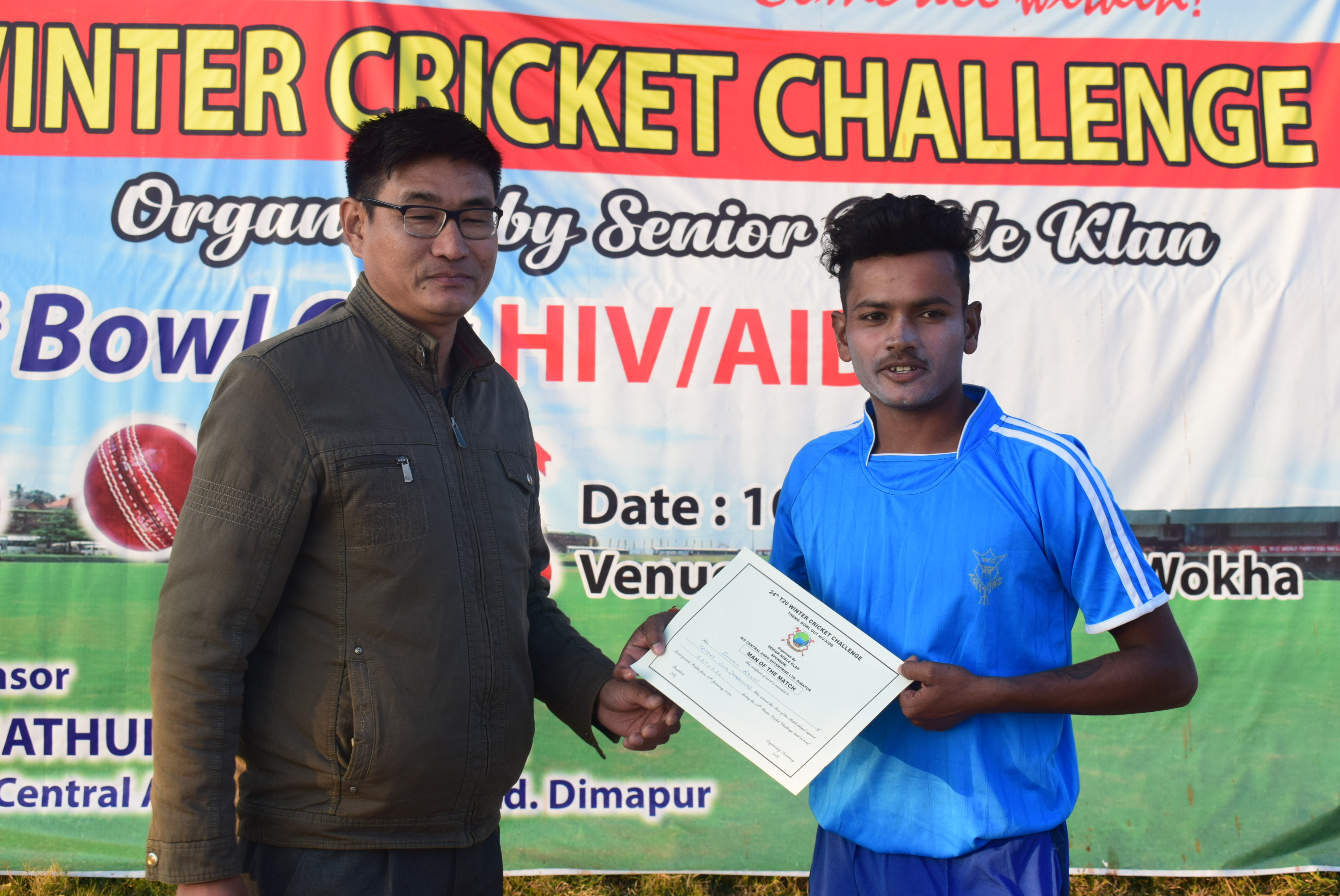 Hachibemo Patton, founding members of Wokha district Sports Commentators Association giving away the man of the match award to Bikran Rawat of Tritons CC.