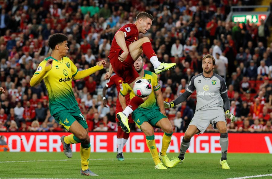9 Liverpool's Roberto Firmino in action with Norwich City's Grant Hanley (Reuters Photo)