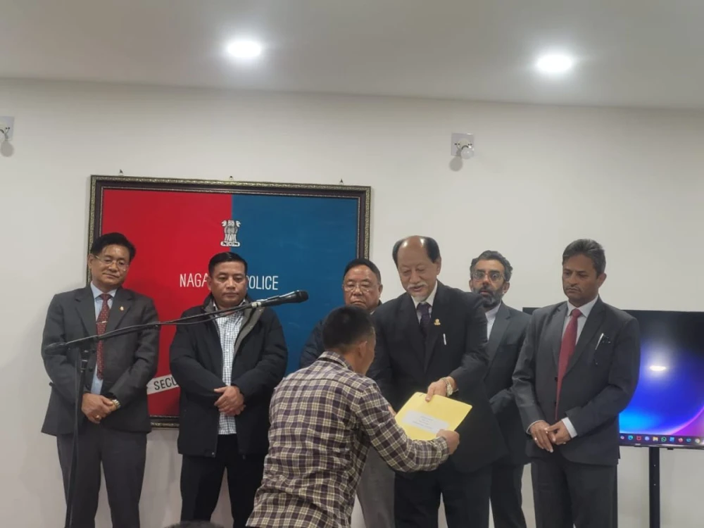 Dr Neiphiu Rio hand over Group Term Life Insurance to nominee of deceased police personnel under Police Salary Package on December 12. (Morung Photo)