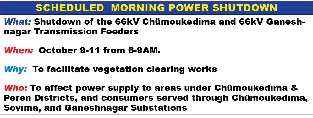 Dimapur, October 8 (MExN): The Department of Power has informed consumers and the general public that there will be a scheduled morning shutdown of the 66kV Chümoukedima and 66kV Ganeshnagar Transmission Feeders to facilitate vegetation clearing work at the Zoological Park (Composite Line).