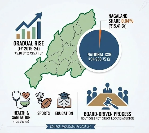 Data placed before Parliament shows that CSR expenditure in Nagaland stood at Rs 5.10 crore in FY 2019–20, declined to Rs 3.57 crore in FY 2020–21 during the COVID-19 pandemic period, and subsequently rose to Rs 12.46 crore in FY 2021–22, Rs 13.57 crore in FY 2022–23, and Rs 15.41 crore in FY 2023–24.