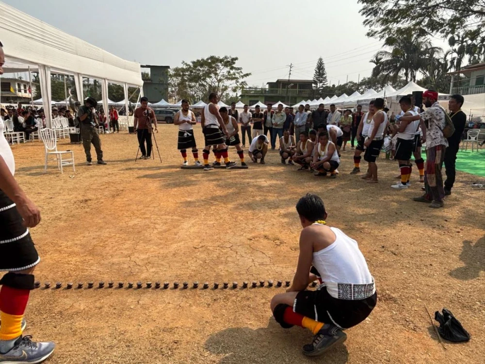 Angami men showcasing a traditional game at the Sekrenyi-cum-Mini Hornbill festival in Sovima village, Chümoukedima, on February 25.