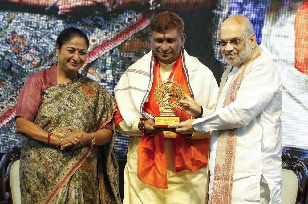 New Delhi: Union Home Minister Amit Shah and Delhi Chief Minister Rekha Gupta present 'Abhinandanpatram' during the 1008 Sanskrit Sambhashan Shivir Mass Closing Ceremony at the Sports Complex in Delhi University, New Delhi, Sunday, May 04, 2025. (Photo: IANS/Wasim Sarvar)