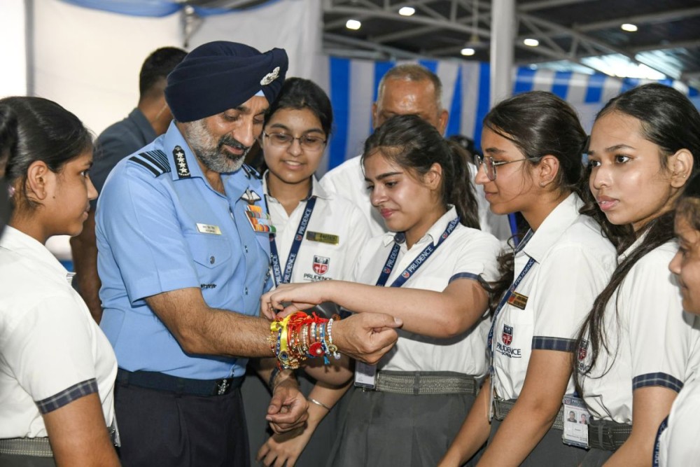 New Delhi: Students tie Rakhi on the wrist of Air Chief Marshal AP Singh, Chief of the Air Staff, during Raksha Bandhan celebrations at the Air Force Station, in New Delhi, Friday, August 8, 2025. (IANS)