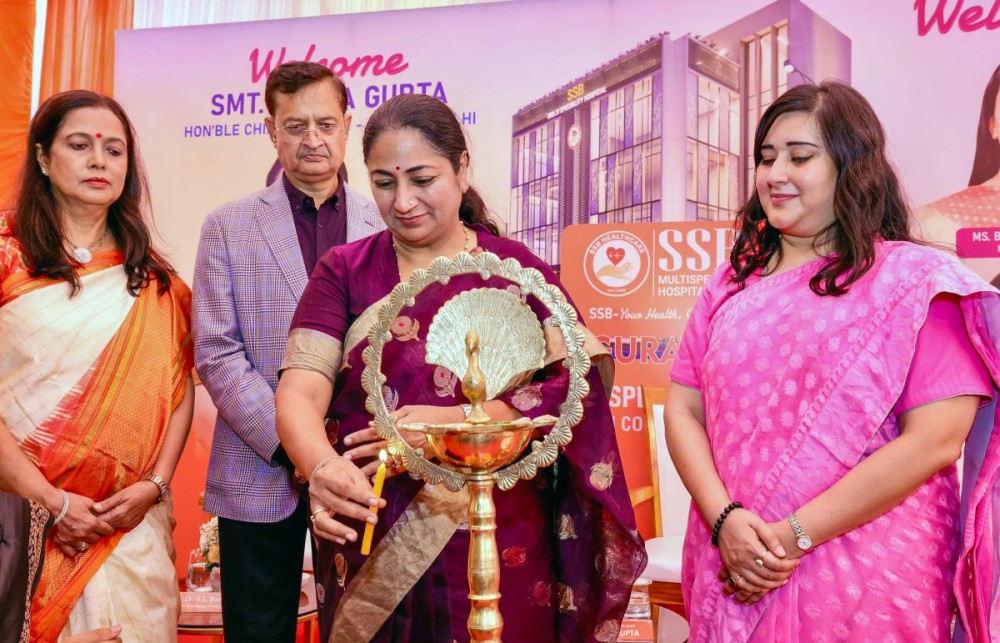 New Delhi: Delhi Chief Minister Rekha Gupta lights a ceremonial lamp during the inauguration of the SSB Multi-Specialty Hospital equipped with modern facilities, at Kailash Colony, in New Delhi on Sunday, August 3, 2025. BJP MP Bansuri Swaraj and party MLA Shikha Rai are also present. (Photo: IANS/X/@gupta_rekha)