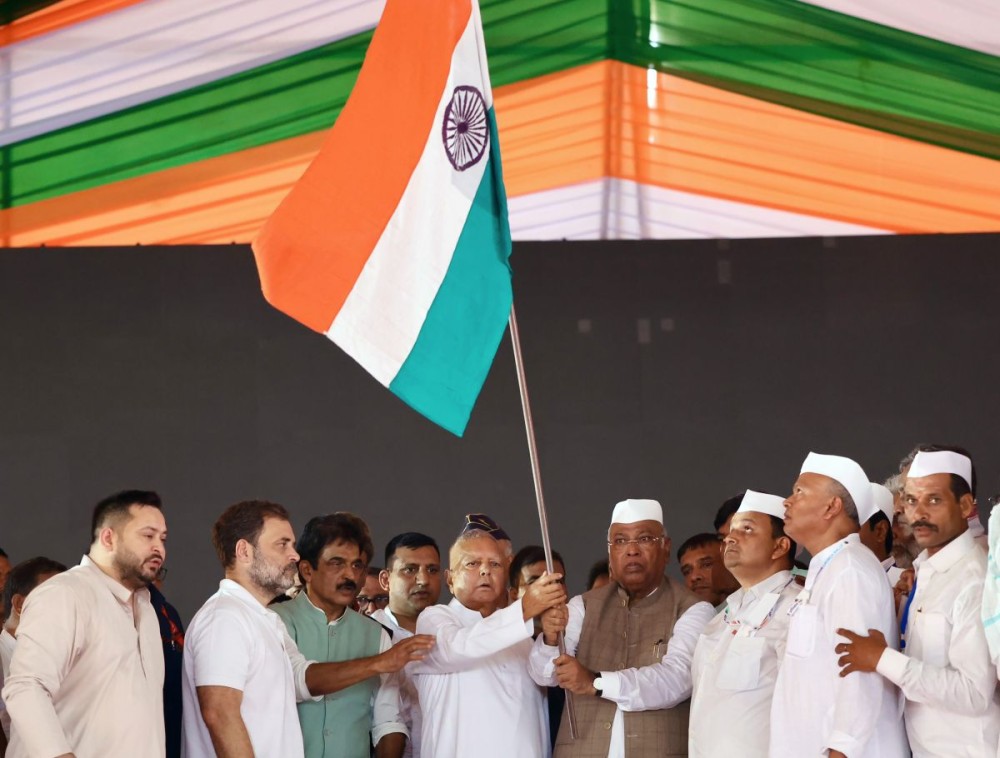 Rohtas: Congress President Mallikarjun Kharge with Lok Sabha LoP Rahul Gandhi, AICC General Secretary K.C. Venugopal, RJD leader Tejashwi Yadav, Rashtriya Janata Dal (RJD) supremo Lalu Prasad Yadav, Bihar Congress President Rajesh Kumar and Communist Party of India (Marxist–Leninist) Liberation General Secretary Dipankar Bhattacharya hold the national flag during "Voter Adhikar Yatra" in Sasaram, Bihar, Sunday, August 17, 2025. (IANS)