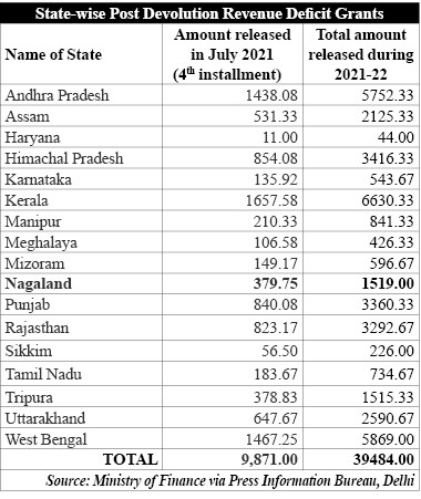 The Fifteenth Finance Commission has recommended a total Post Devolution Revenue Deficit Grant of Rs 1,18,452 crore to 17 states in the financial year 2021-22.