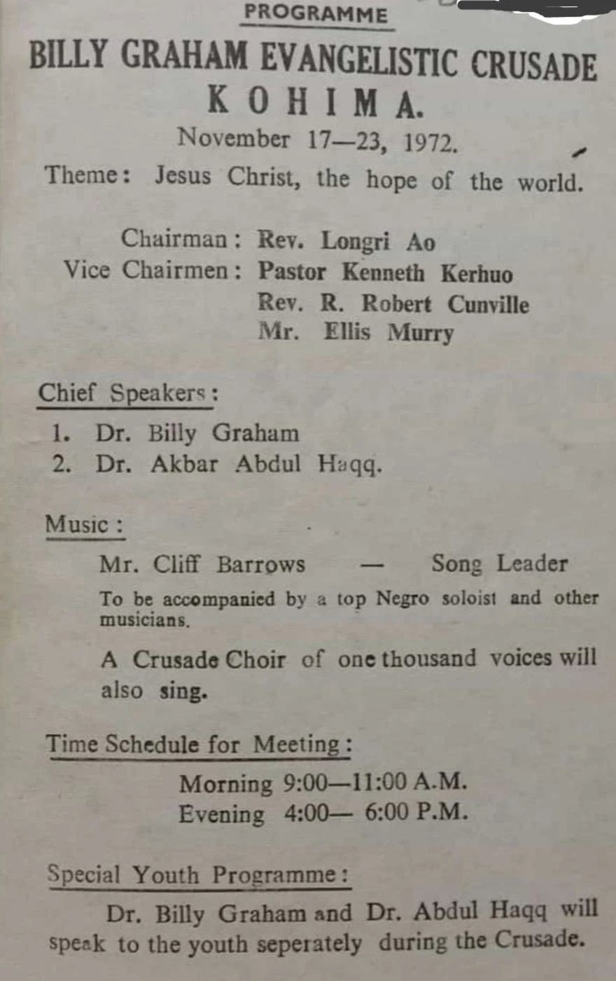 The ‘Billy Graham Evangelistic Crusade,’ also known as the “Kohima Miracle,” was held from November 17–23, 1972. The preacher died on February 21, 2018, at the age of 99 in North Carolina, USA.