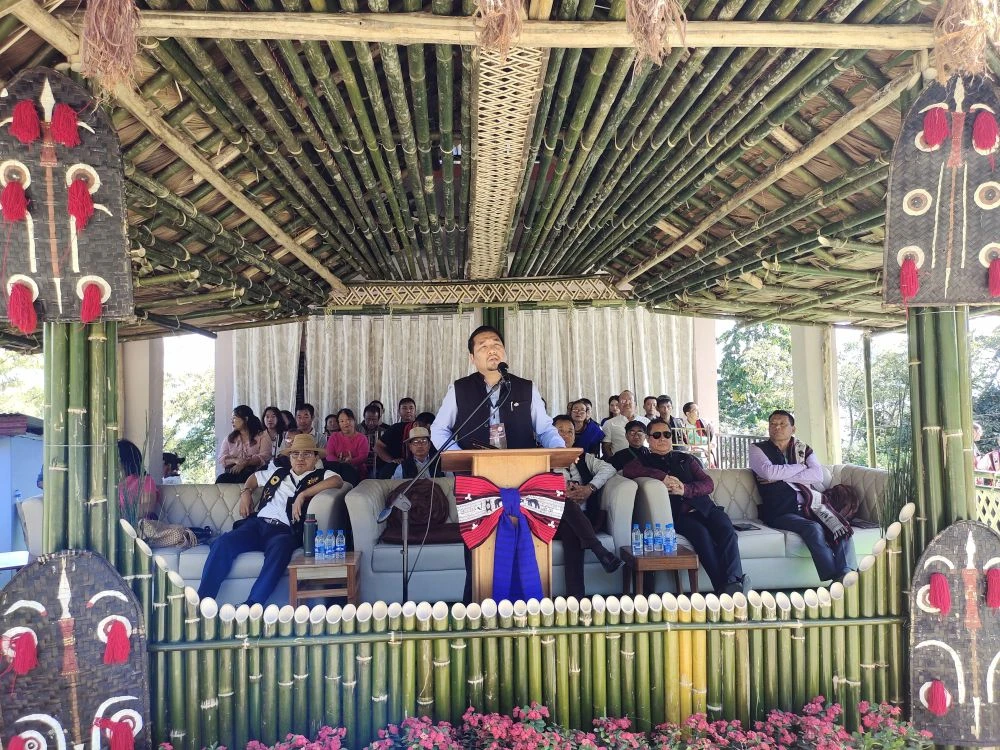 Tongpang Ozukum, MLA and Advisor for Water Resources addresses the final of the P Shilu Ao Memorial Indigenous Games Festival-cum-2nd Tug of War Championship 2025 at Longjang village, Mokokchung from November 8. (Morung Photo)