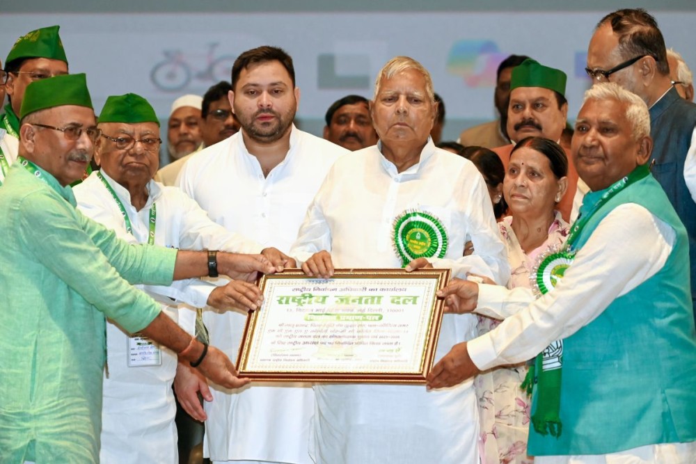 Patna: Rashtriya Janata Dal (RJD) supremo Lalu Prasad Yadav and RJD leader and Bihar Leader of Opposition Tejashwi Yadav during the RJD national executive meeting at Bapu Sabhagar, in Patna, Saturday, July 05, 2025. Rashtriya Janata Dal supremo Lalu Prasad Yadav declared as the party's National President. (Photo: IANS)