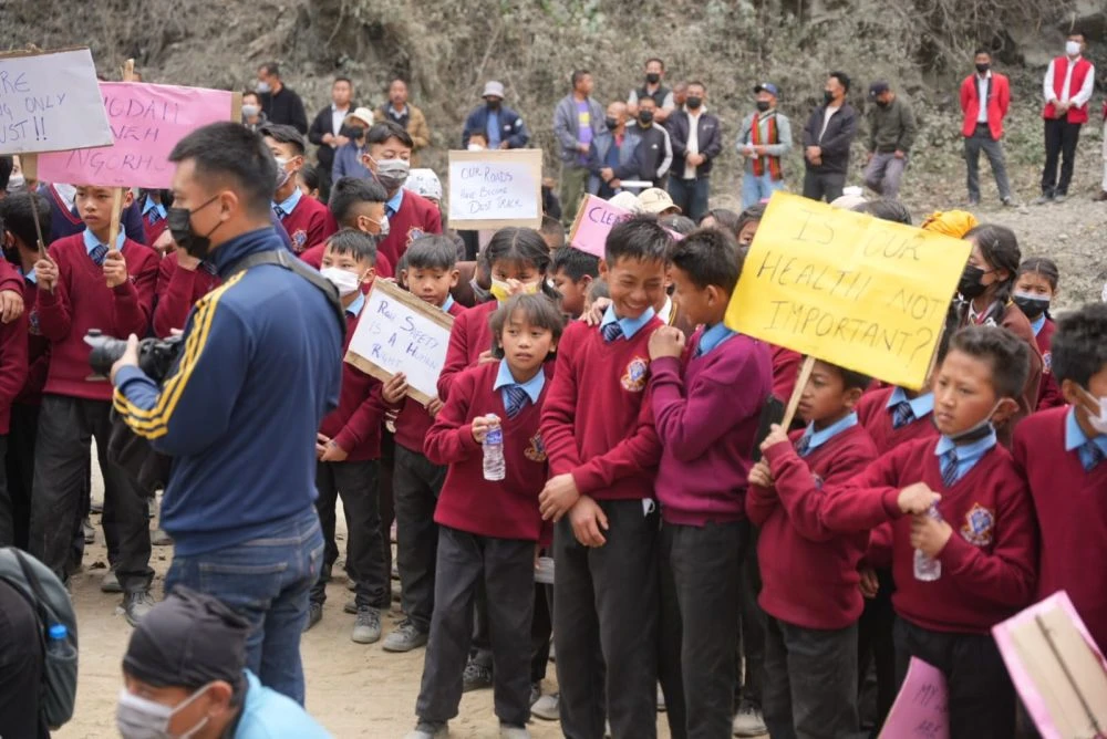 Students with placards join the protest organised by Khuzama Students' Care Union against bad roads along the National Highway-2 Khuzama village on March 11. (Photo Credit: KSCU)