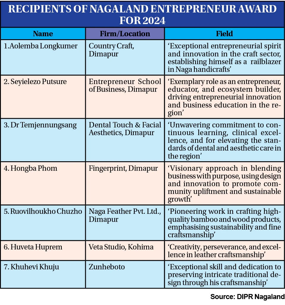 The recipients were Aolemba Longkumer of Country Craft; Seyielezo Putsure of the Entrepreneur School of Business; Dr Temjennungsang of Dental Touch & Facial Aesthetics; Hongba Phom of Fingerprint; Ruovilhoukho Chuzho of Naga Feather Pvt. Ltd; Huveta Huprem of Veta Studio; and Khuhevi Khuju of Zunheboto.
