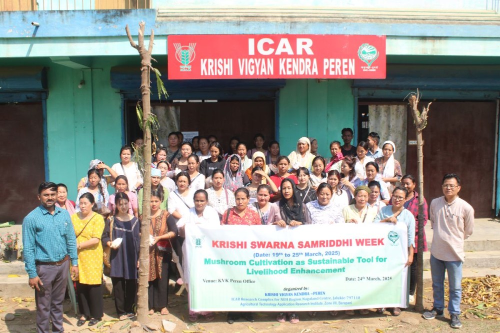 ICAR Krishi Vigyan Kendra (KVK), Peren organised training on ‘mushroom cultivation as sustainable tool for livelihood enhancement’ at KVK Jalukie on March 24 as part of of the ‘Krishi Swarna Samriddhi Week’ programme. The event was addressed by Dr KL Meena Principal Scientist & Head, KVK Peren and Dr Prashant Kalal, SMS-Fruit Science, KVK Peren. Z James Kikon, CTO-Soil Science, KVK Peren delivered technical aspect of mushroom cultivation with low-cost investment. Inputs such as mushroom spawn and grow bags were distributed to the 53 participants of the Peren district.