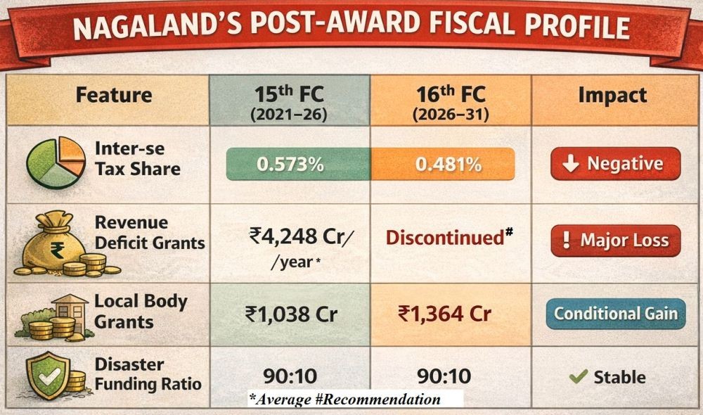Nagaland is set to face a significant reduction in assured fiscal support under the Sixteenth Finance Commission (16th FC) award period (2026–31), following a reduction in the State’s share in tax devolution and the possible withdrawal of Post-Devolution Revenue Deficit Grants (RDG).