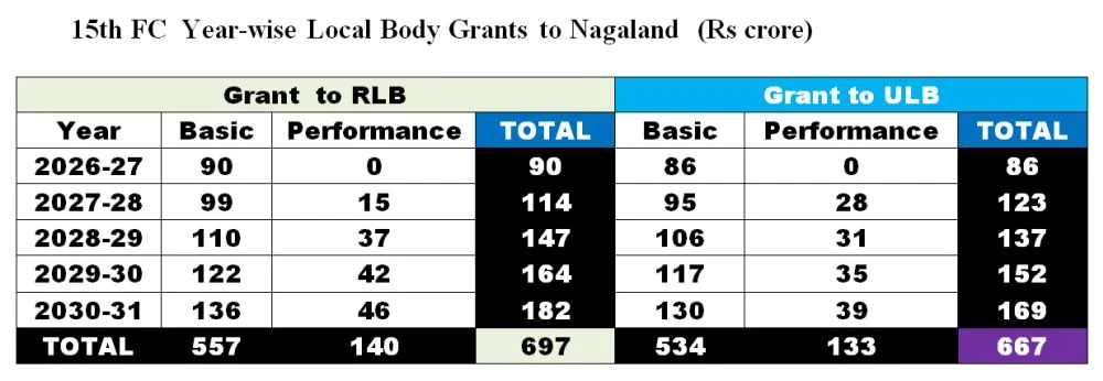 Under the 16th FC award, Nagaland is set to receive Rs 1,364 crore in local body grants over the five-year period from 2026–27 to 2030–31. This includes Rs 697 crore for rural local bodies (RLBs) and Rs 667 crore for urban local bodies (ULBs), marking an increase from Rs 1,038 crore awarded under the 15th FC.