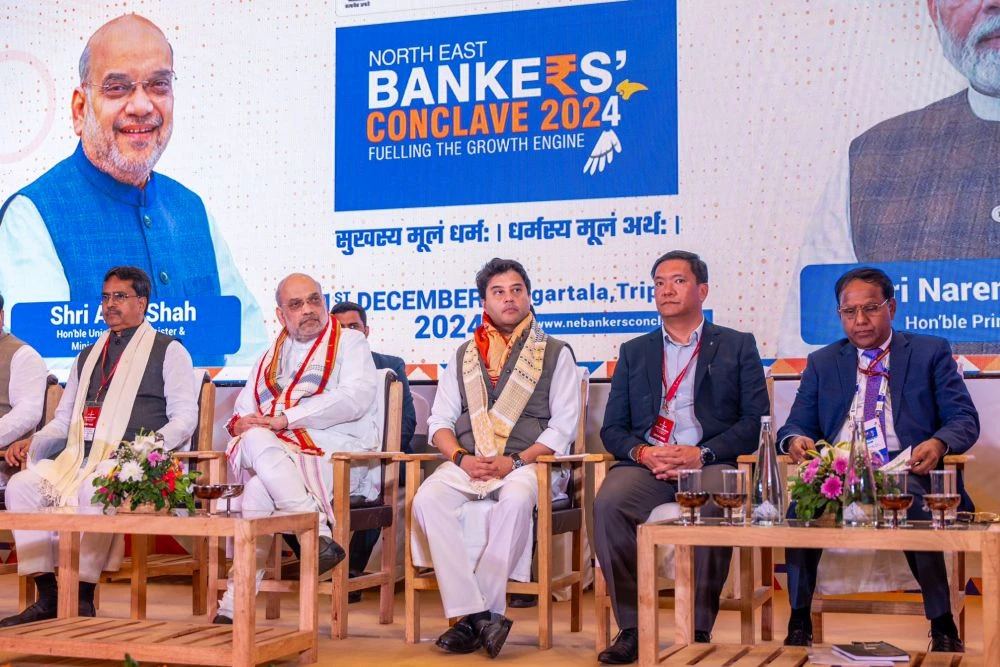 Agartala: Union Home Minister Amit Shah, Union Minister Jyotiraditya Scindia, and Tripura Chief Minister Manik Saha during the North East Bankers' Conclave 2024 in Agartala on Saturday, December 21, 2024. (Photo: IANS)