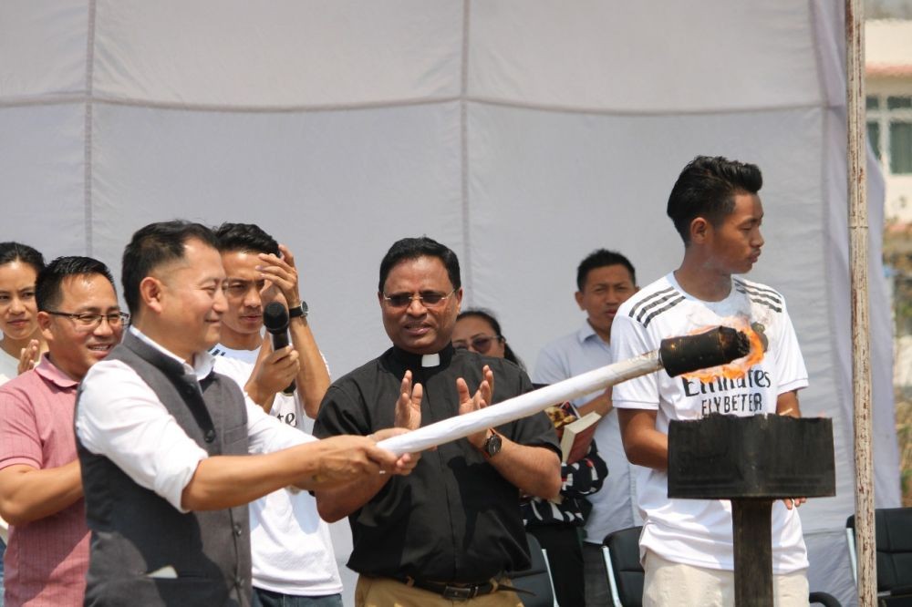 Special Guest Dr Tolto Metha lights the ceremonial torch to mark the opening of the 10th Annual Sports Meet 2025 of the North East Institute of Social Sciences and Research at Peace Centre Chümoukedima on March 25. (Image Courtesy: NEISSR)