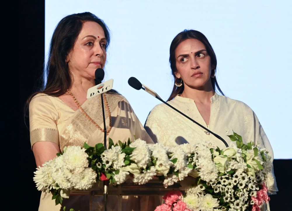 New Delhi: Actress and wife of Dharmendra, Hema Malini, speaks at the prayer meet in memory of actor Dharmendra as actress and daughter of Dharmendra, Esha Deol, looks on at the Dr. Ambedkar International Centre in New Delhi on Thursday, December 11, 2025. (Photo: IANS/Prem Nath Pandey)