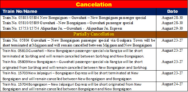 Guwahati, August 23 (MExN): The Northeast Frontier Railway (NFR) today informed that some trains have been either cancelled or partially cancelled in some areas under its jurisdiction due to ongoing development works.