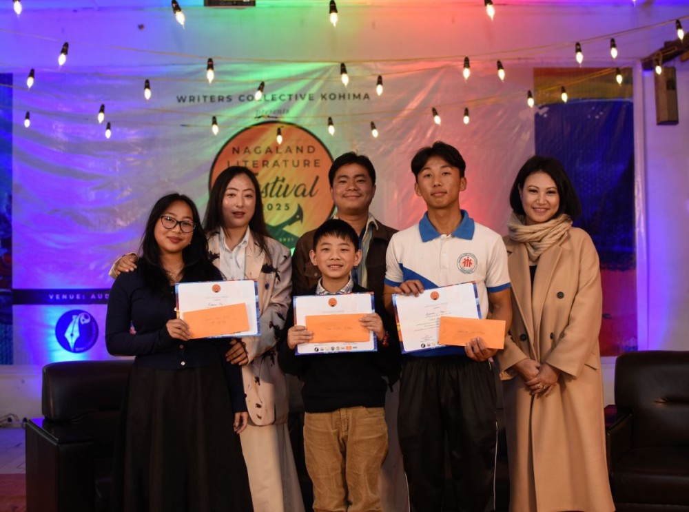 Winners of the “What You Will” competition organised as part of the 5th Edition of Nagaland Literature Festival with the judges, Mengu Suokhrie, Azi Nienu and Akavi on December 13 at Don Bosco Higher Secondary School Kohima.