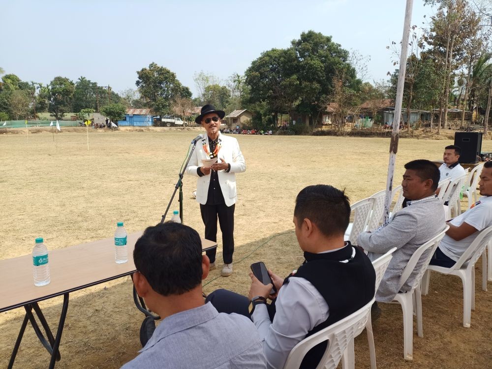 Rev Dr Phughoto Sema addressing the Open Penalty Shootout Tournament held at New Jalukie on March 14. (DIPR Photo)