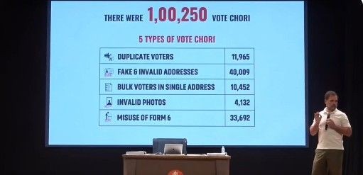 "First, duplicate voters. As many as 11,965 entries were found to be duplicated across multiple booths and even states. Names like Gurkirat Singh and Aditya Shrivastava appeared multiple times and in the case of Shrivastava, his name appeared in different states — Karnataka, Maharashtra, and Uttar Pradesh,” said LoP Gandhi.