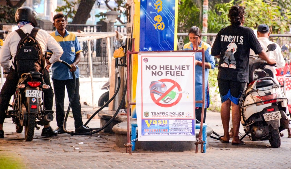Visakhapatnam: A poster displayed at a petrol pump as the city traffic police introduce the ‘no helmet, no fuel’ norm for two-wheeler riders from the New Year, in Visakhapatnam on Tuesday, December 30, 2025. (Photo: IANS)