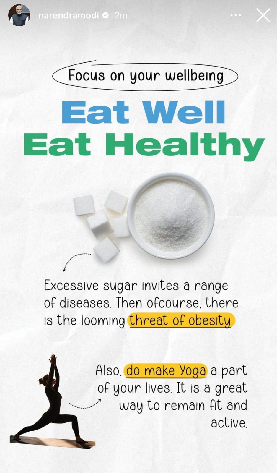 The social media post highlighted the health risks associated with excessive sugar consumption, including diseases and the growing threat of obesity, and also recommended practising yoga to remain fit and active.