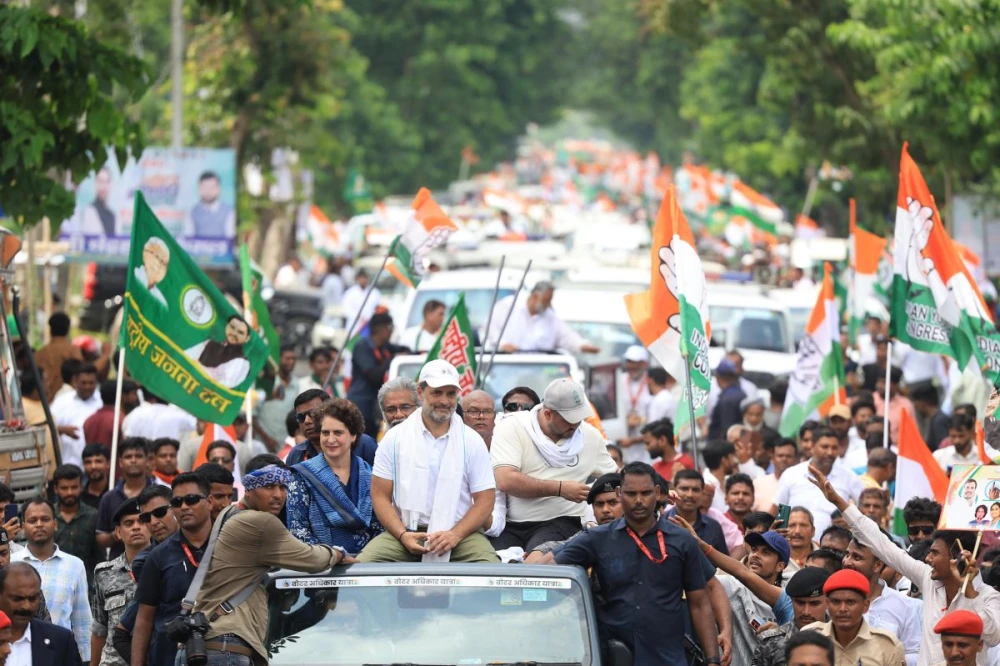 Patna, August 26 (IANS) Congress leader Priyanka Gandhi Vadra and Telangana Chief Minister Revanth Reddy on Tuesday joined Rahul Gandhi and RJD leader Tejashwi Yadav's ongoing ‘Voter Adhikar Yatra’ in Bihar’s Supaul.