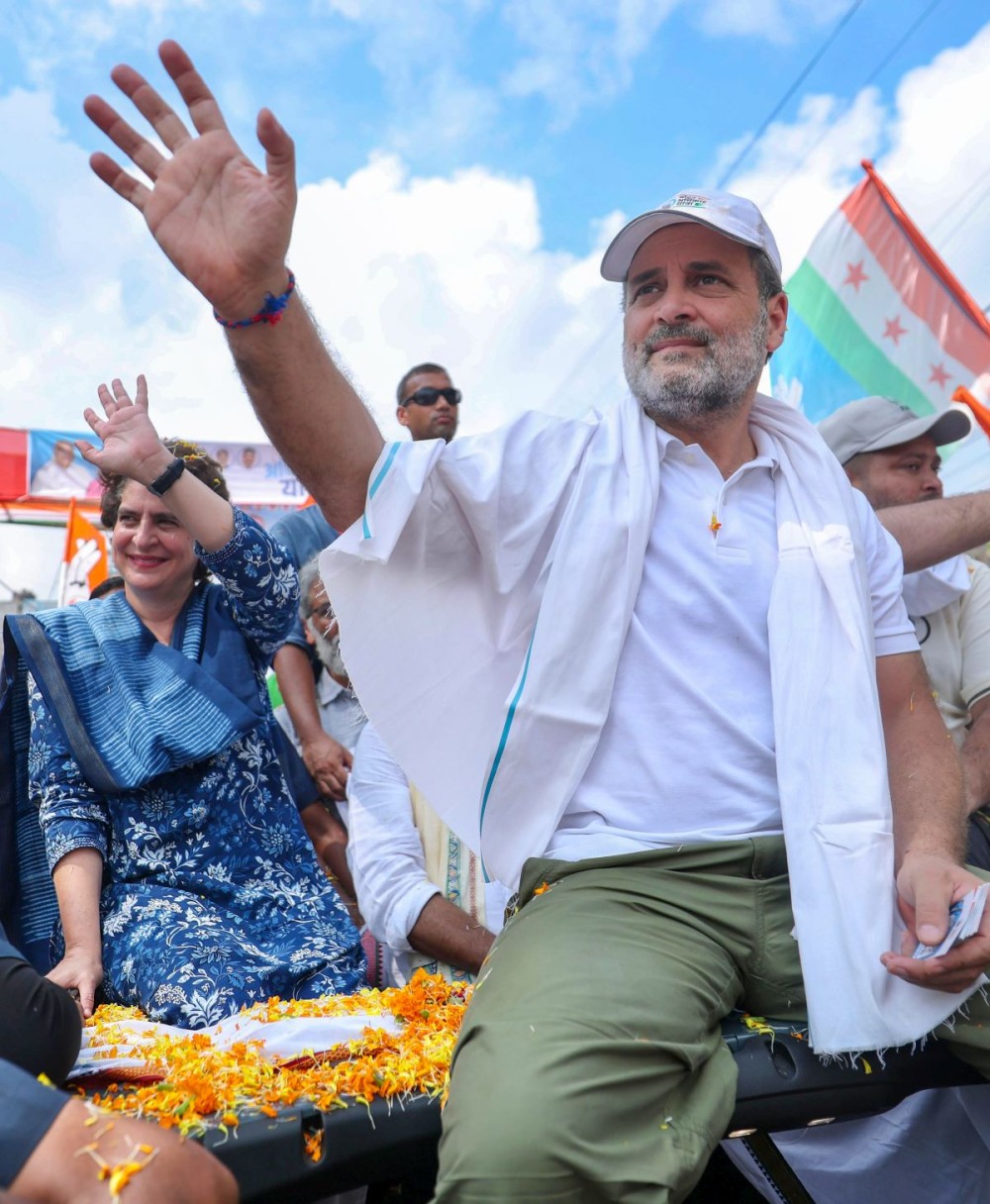 Priyanka Gandhi, Revanth Reddy sat with Rahul Gandhi and a few other leaders of the INDIA bloc on the roof of an SUV, which was moving slowly, as they waved at the crowd.
