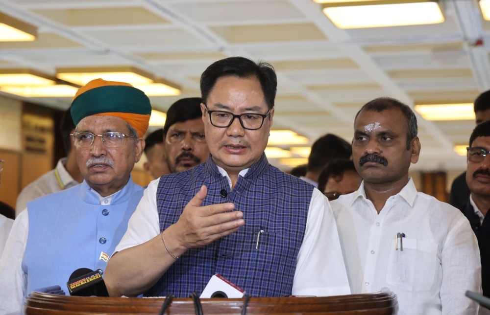 New Delhi: Union Minister Kiren Rijiju speaks to the media after attending the All-Party Meeting ahead of the Monsoon Session of Parliament that begins tomorrow, i.e., 21st July, in New Delhi, Sunday, July 20, 2025. Union Ministers L. Murugan, and Arjun Ram Meghwal also present. (Photo: IANS/Prem Nath Pandey)