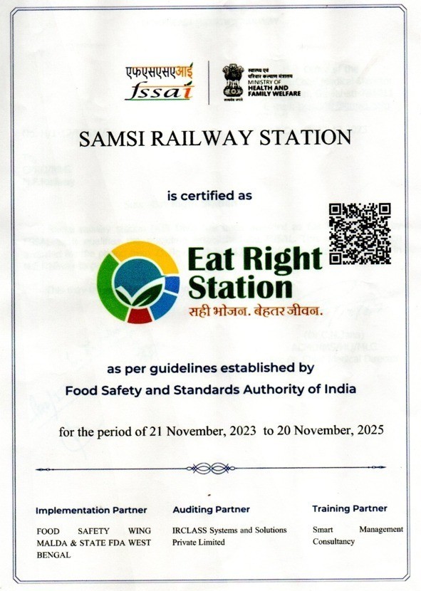 Maligaon, December 15 (MExN): The Samsi Railway Station under Katihar division of NF Railway has been awarded ‘Eat Right Station’ certification by FSSAI (Food Safety and Standards Authority of India) in recognition ofproviding high-quality, nutritious food to passengers. The station has been able to qualify the guidelines established by FSSAI and becomes the sixth railway station in NF Railway to get this status. This certification has been awarded for the period from November 21, 2023 to November 21, 2025.