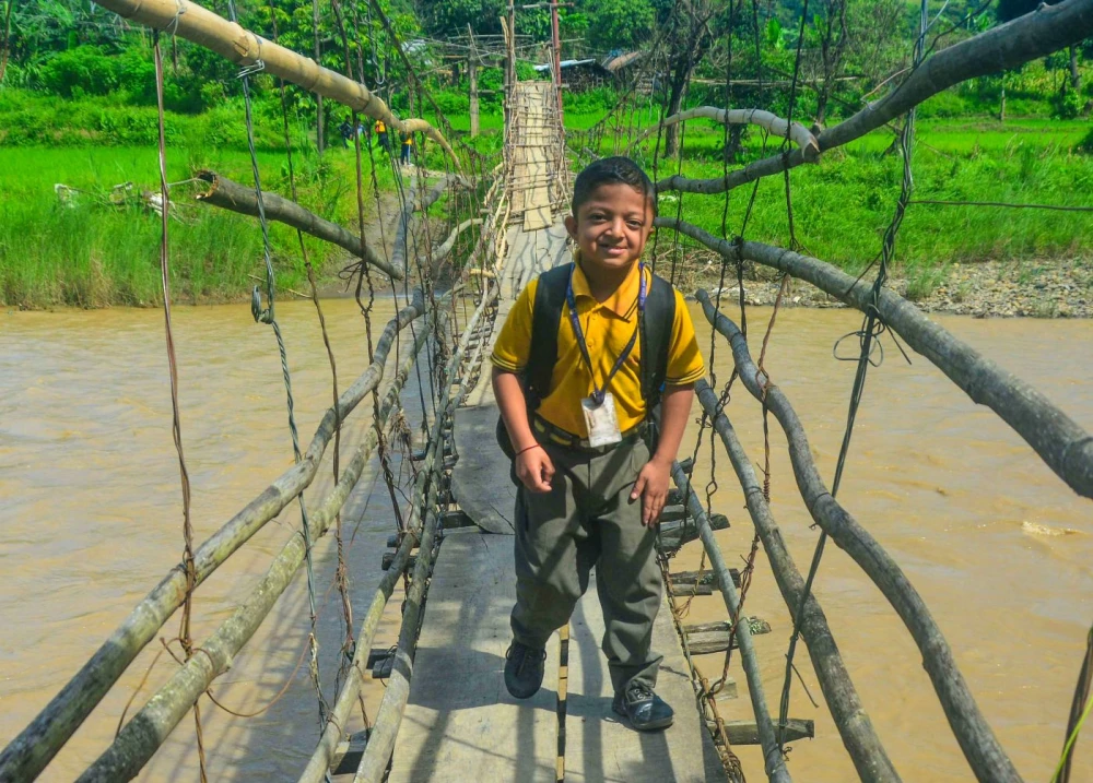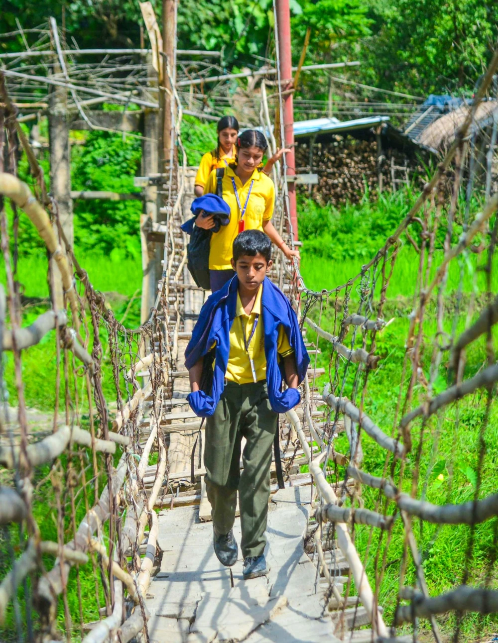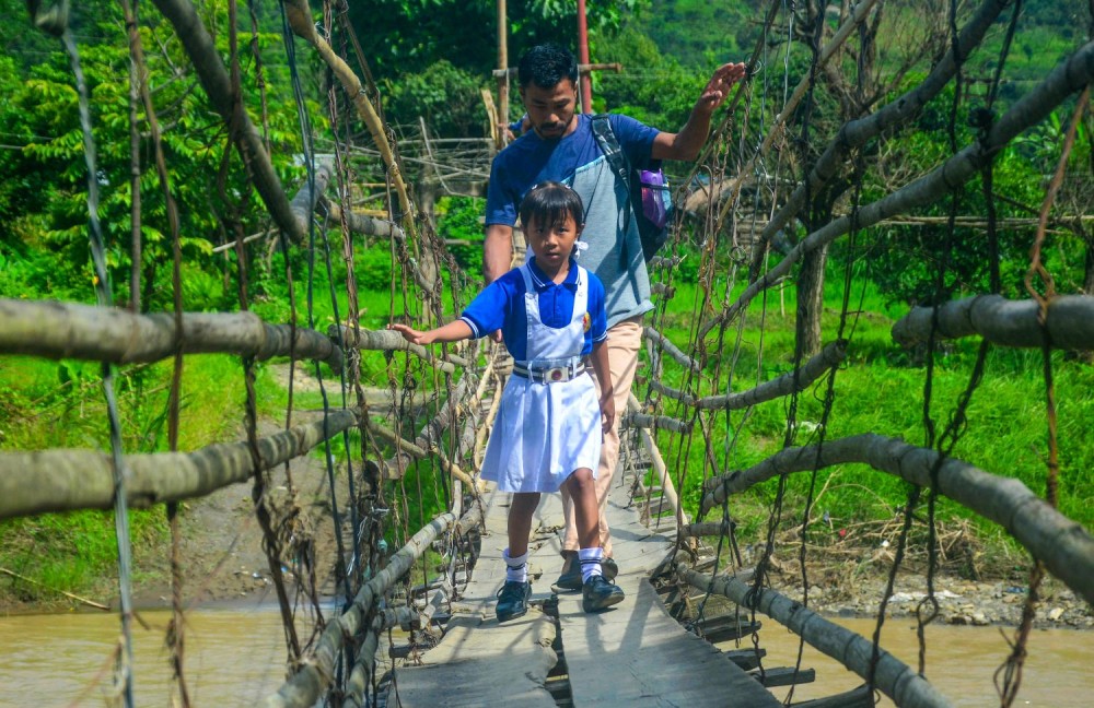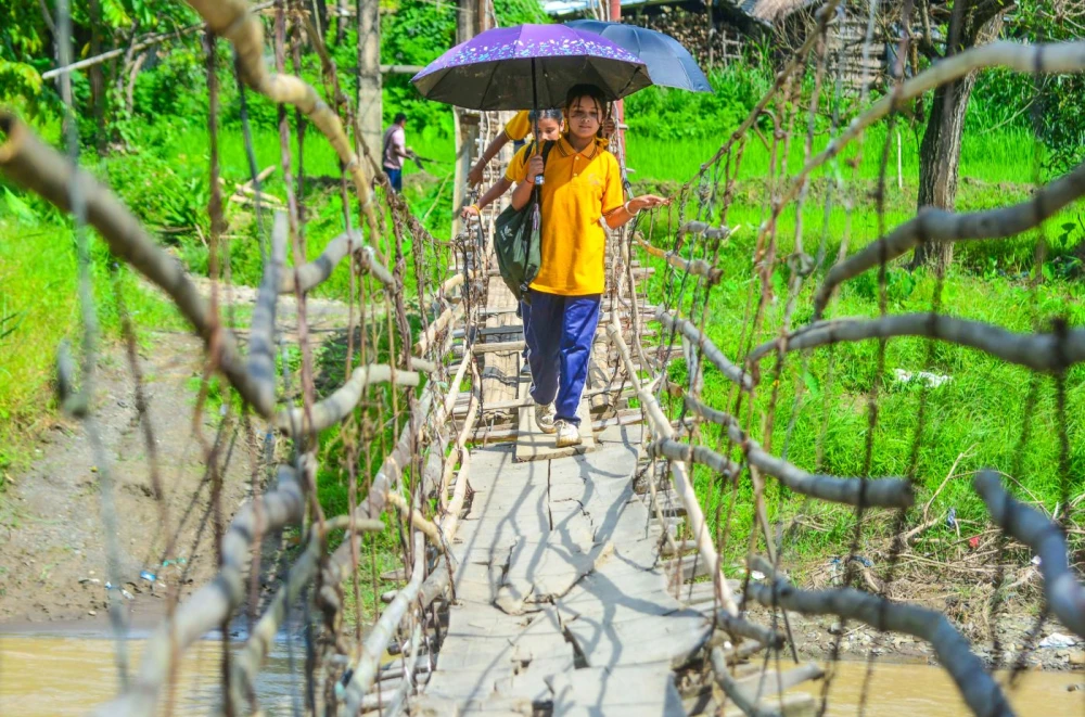 Senapati: A student along with her parent walks over a hanging bridge to attend school in Senapati, Manipur on Thursday, July 31, 2025. (Photo: IANS)